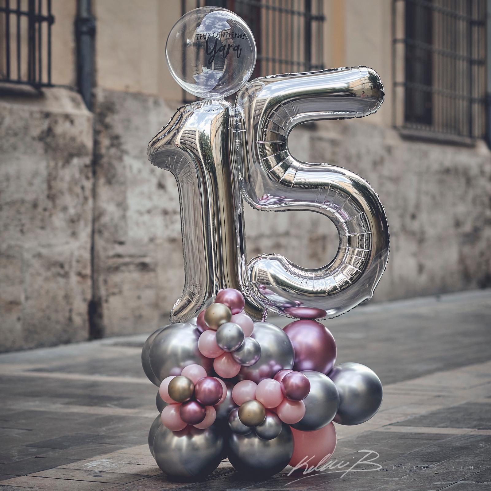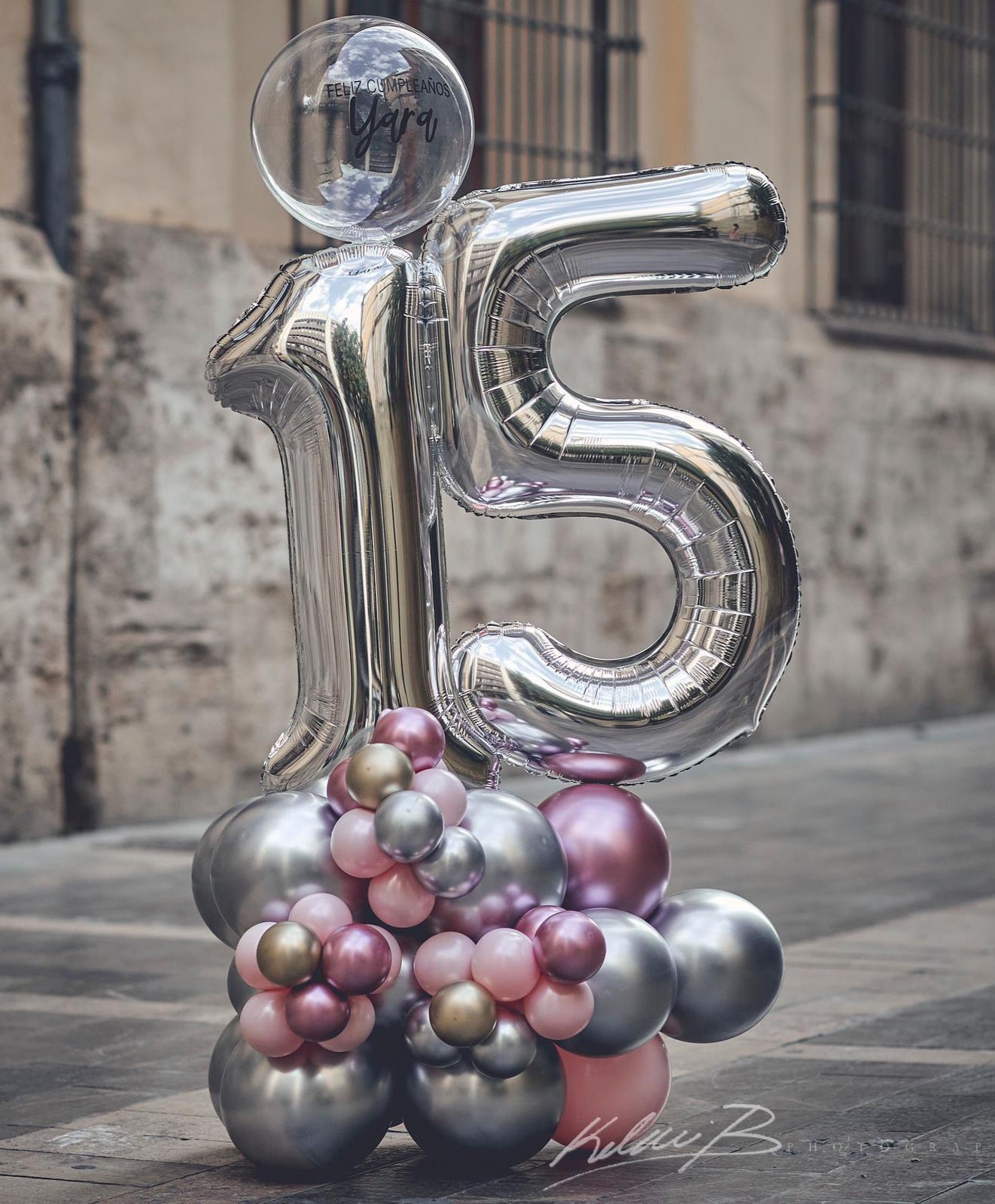 Los números de globo están montados en una elegante base hecha de globos de látex, lo que le da estabilidad y un aspecto sofisticado al bouquet.