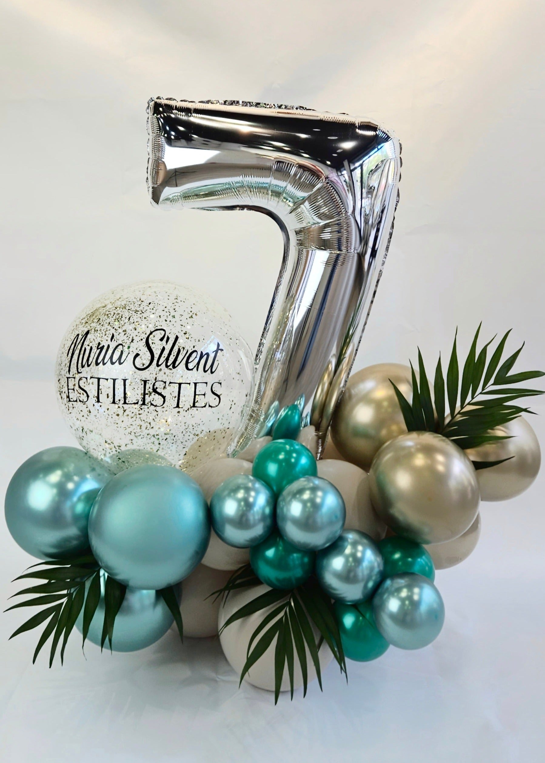 Los números de globo están montados en una elegante base hecha de globos de látex, lo que le da estabilidad y un aspecto sofisticado al bouquet.