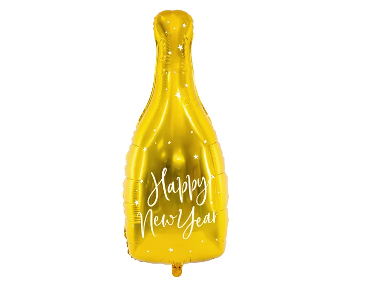 Globo metálico de aluminio Botella en color dorado con impresión blanca ''Feliz Año Nuevo'', tamaño aprox. 32 x 82 cm (12,5 x 32,5'').